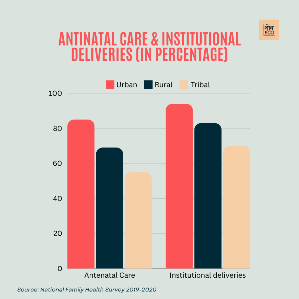 Antenatal Care (ANC): There was also a significant gap in the proportion of at least four ANC visits by pregnant women — 55% for tribal areas.