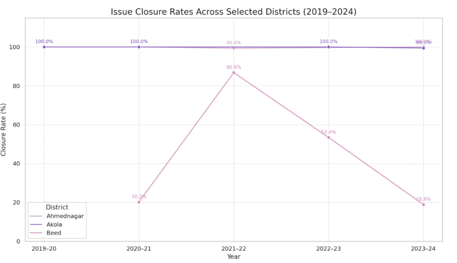 Graph 2: Issue Closure Rates Across Ahmednagar, Akola and Beed (2019-2024)