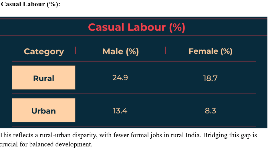 This reflects a rural-urban disparity, with fewer formal jobs in rural India. Bridging this gap is crucial for balanced development.